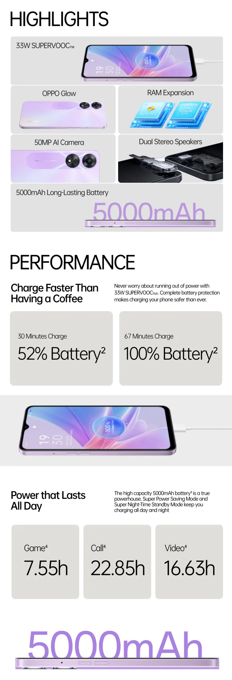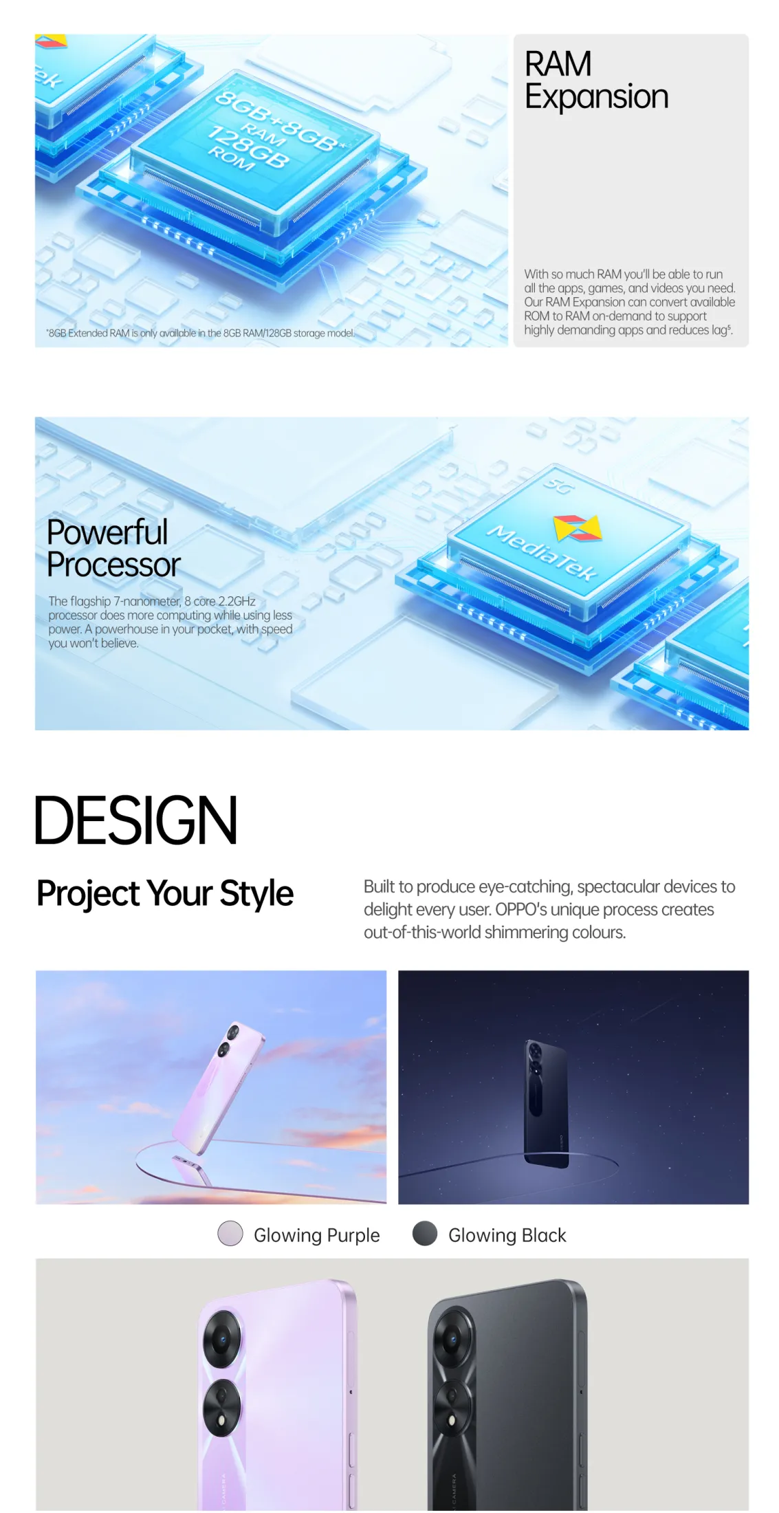 Featuring 33W SUPERVOOCTM and a 5,000mAh large battery, the OPPO A78 5G delivers improvements in battery and charging to guarantee a reliable and long-lasting experience. Through enhancements in both hardware and software, the A78 5G brings an all-round smooth performance alongside upgraded camera and entertainment features. Housed in a trendy design featuring the iconic OPPO Glow, the A78 5G also comes equipped with the ColorOS 13, providing convenient and efficient features in a fashion-forward device.